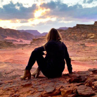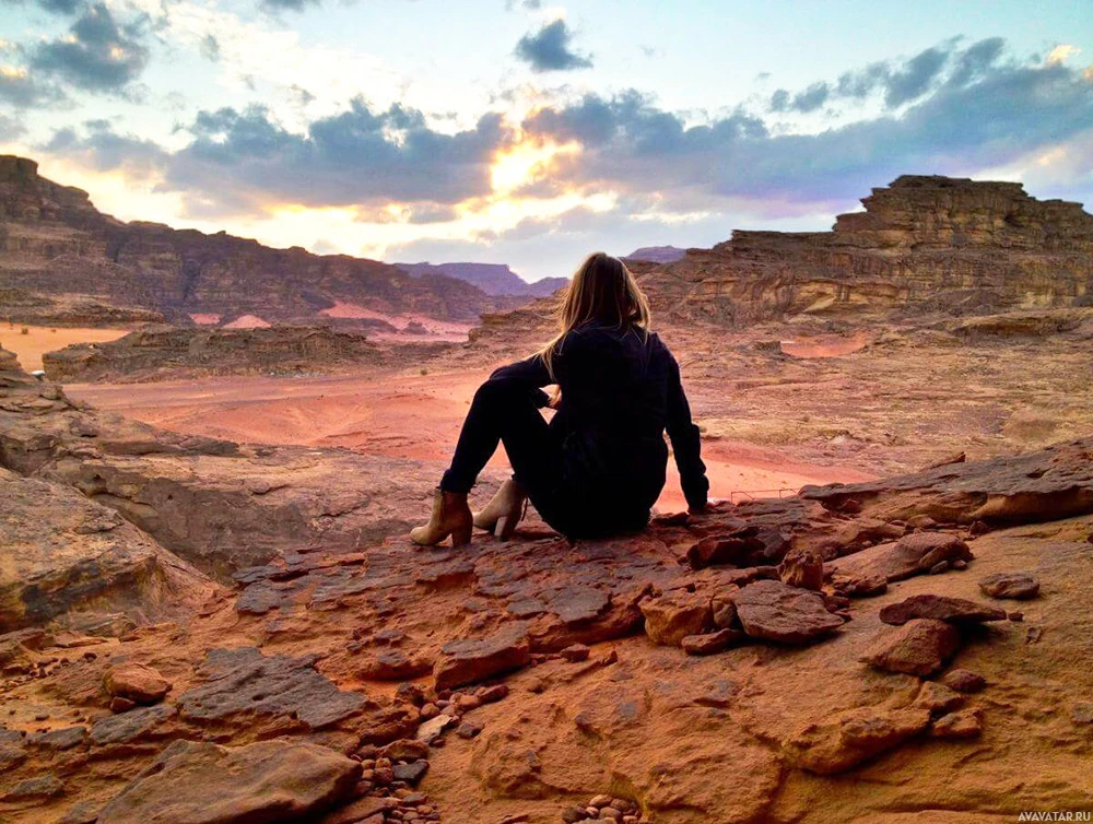 rocky terrain at what appears to be sunset or sunrise. The individual is facing away from the camera, and their back is turned towards us. They are wearing a dark-colored top and pants that blend with the desert color palette. In front of them are layers of