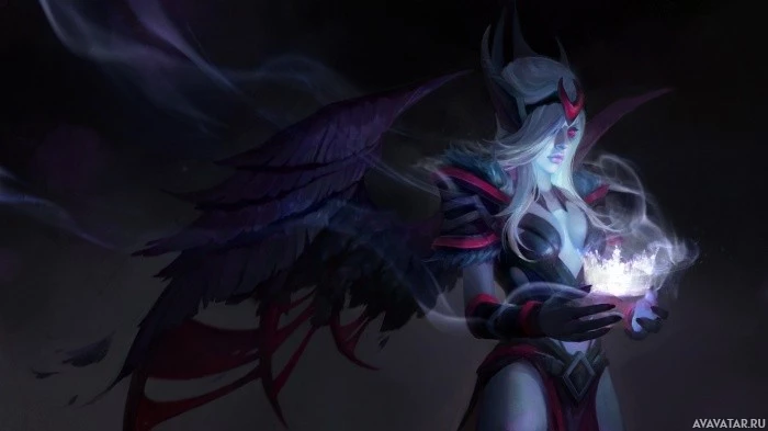 Vengeful Spirit," which is a hero in the game. She has wings and is holding what appears to be an object that could be an item or weapon typically found within the game's context, such as a staff or wand. The design and style are indicative of the fantasy elements commonly found in this game.