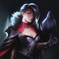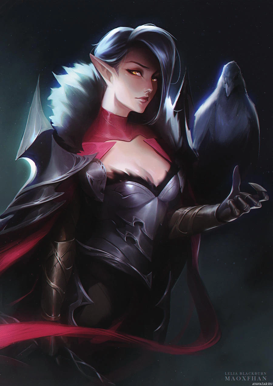 red eyes, giving her an intimidating and mystical look. The character is wearing armor with a fuzzy or fur-like trim, suggesting she might have some animalistic features such as those of a crow or another bird. Her expression is serious and intense, which fits