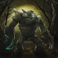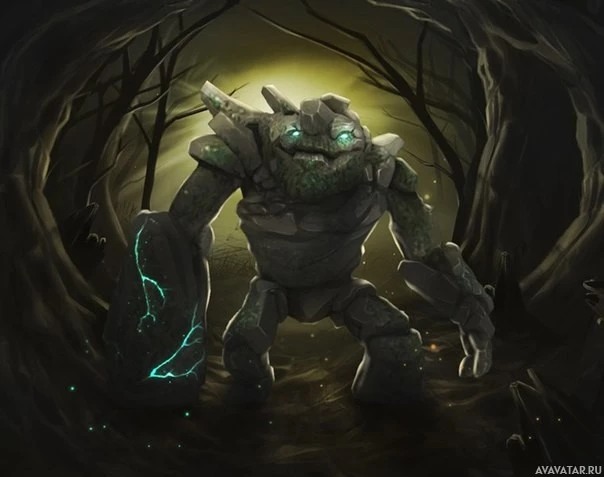 The image shows a character from the game "Dota 2," known as Tiny. He is depicted as a small, muscular creature with