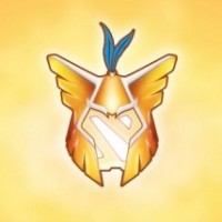 Mage character from the game. The logo consists of two crossed swords with a bolt of lightning between them, set against an orange background with
