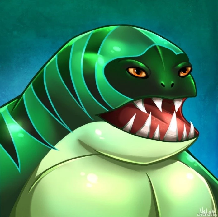 large size and aquatic theme with green scales and an open-mouthed expression that gives it a menacing appearance.