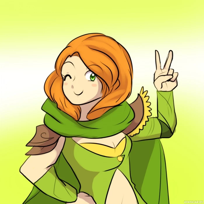 red hair, is wearing a green outfit that could suggest she might be from the game Dota 2 and is playing the Windranger hero, known for her archery skills. She's also holding a bow and making a peace sign with her hand, which is a common gesture of friendship or victory in
