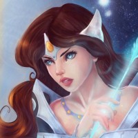 blonde hair and blue eyes, wearing an armor with a bow and arrow on her back. Her expression is serious, and she seems to be aiming or preparing for battle. The setting includes a cosmic background with stars, suggesting a fantasy or