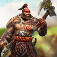 The image shows a character from the game "Dota 2." This character is known as Beastmaster, identifiable by his distinctive beard, attire, and weapon. He appears to be in action, possibly fighting against enemy characters in the game's environment.