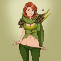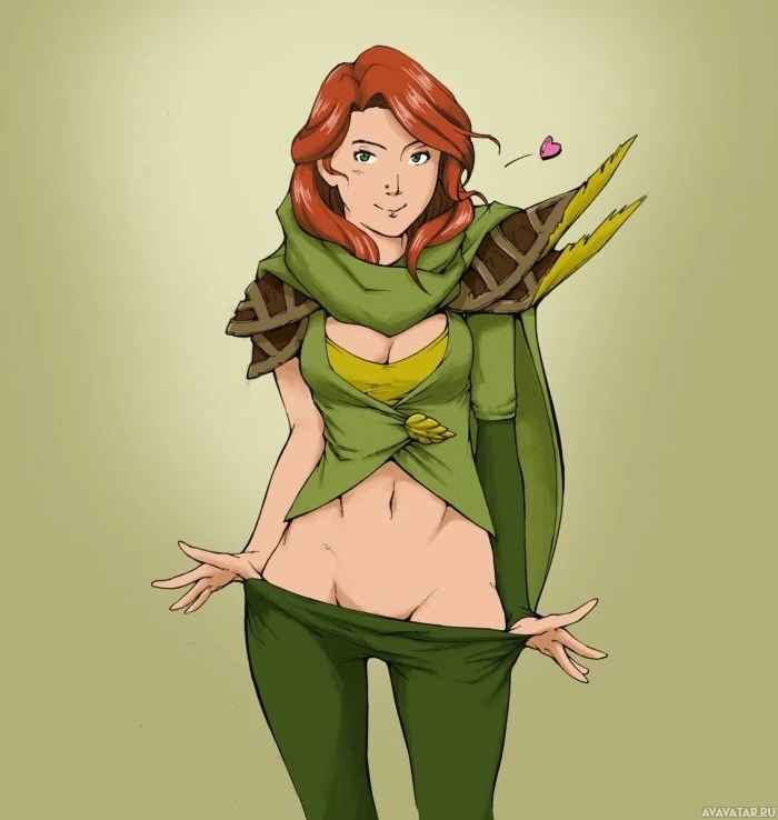 a green costume that includes a cape and what appears to be armor, which resembles the Windranger from the game Dota 2. The