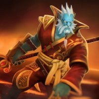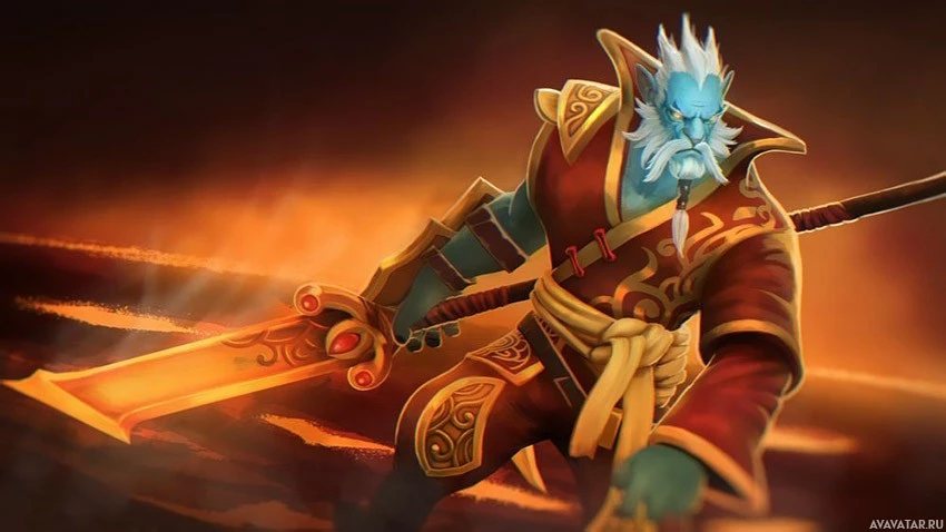 a skull design on his chest, wearing a helmet that has white bone-like structures on top. He holds two swords crossed in front of him. The background features what appears to be an infernal landscape, possibly indicating a theme related to the underworld or