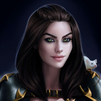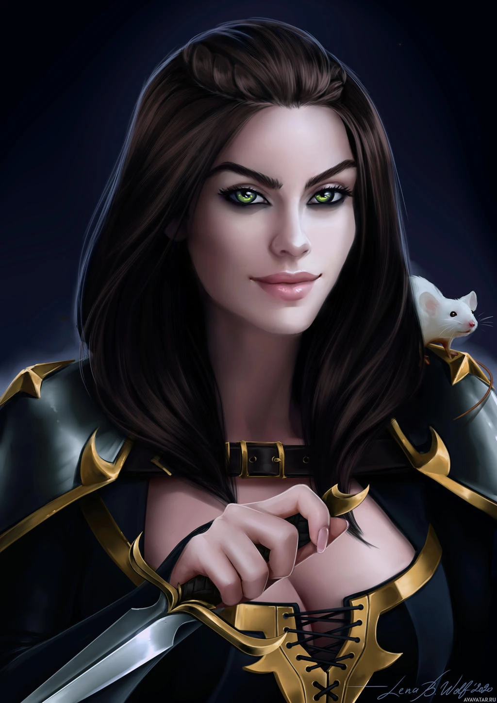 a black top and has a somewhat stern expression on her face. There are also visible elements that resemble armor or