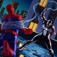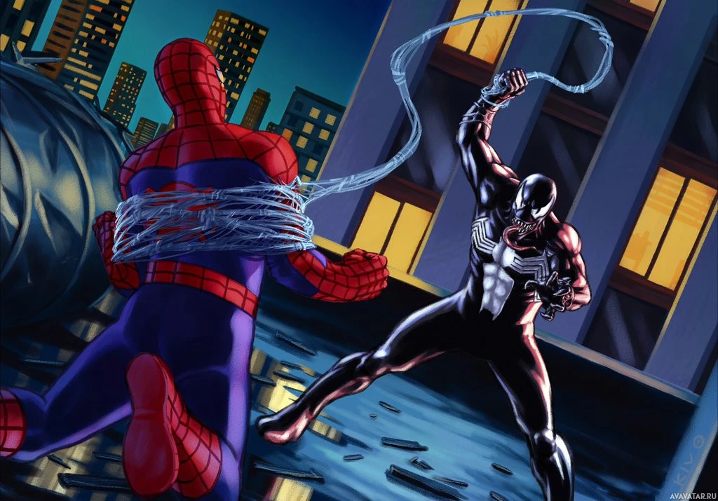 a black bodysuit with white markings, which resembles the Venom costume. They appear to be in