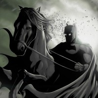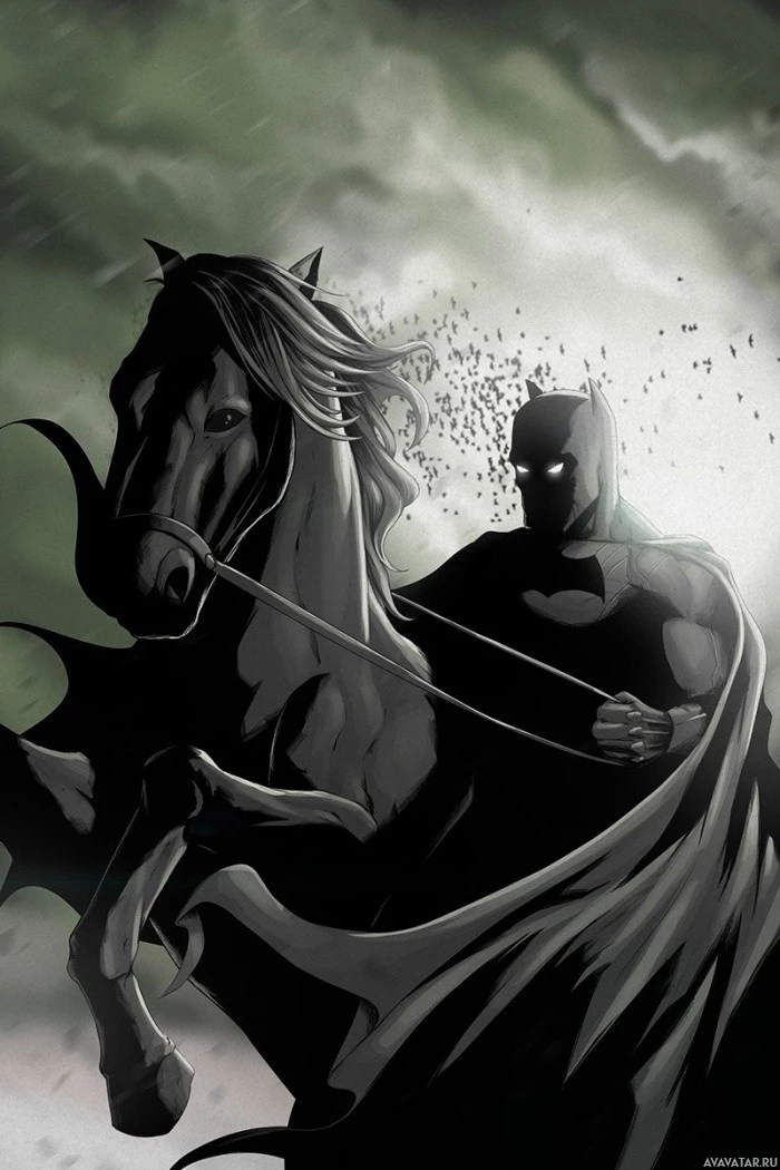 На картинке изображен иллюстрированный персонаж, который, кажется, Бэтмен верхом на лошади. Это изображение обычно не встречается, так как традиционный персонаж Бэтмена часто показан в более современной обстановке, используя автомобиль или другие моторизованные транспортные средства, а не лошадь для транспортировки. Произведение придает классическое и несколько романтизированное ощущение по сравнению с обычным современным стилем, связанным с появлением Бэтмена в различных СМИ.