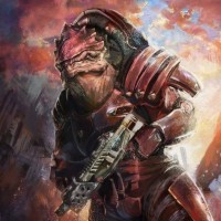 an alien species in the game. The Krogan is depicted holding what appears to be a firearm and is dressed in