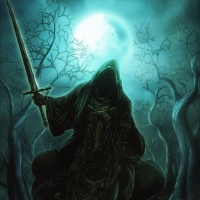 a dark cloak and appears to be holding some sort of staff or weapon. In the background, there's