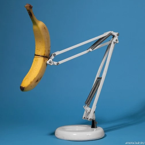 На картинке изображен банан, который, по-видимому, выполнен в форме лампы, в комплекте с белым основанием и регулируемой рукой. Это игривое представление, объединяющее элементы фруктов и мебели в одно художественное произведение.