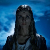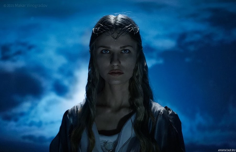 The image features a person dressed as the character Galadriel from the "Middle-earth" series, possibly inspired by the cosplay of this character. The individual is depicted with