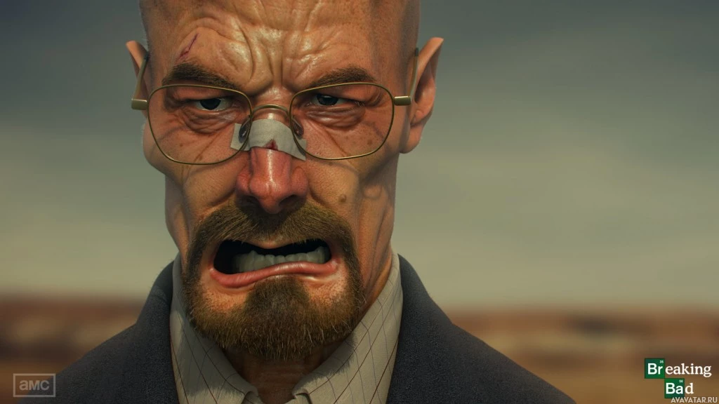 На этом изображении изображен анимированный персонаж, похожий на Уолтера Уайта из телешоу «Во все тяжкие». Стиль произведения придает ему более реалистичный и детализированный внешний вид по сравнению с оригинальной серией.