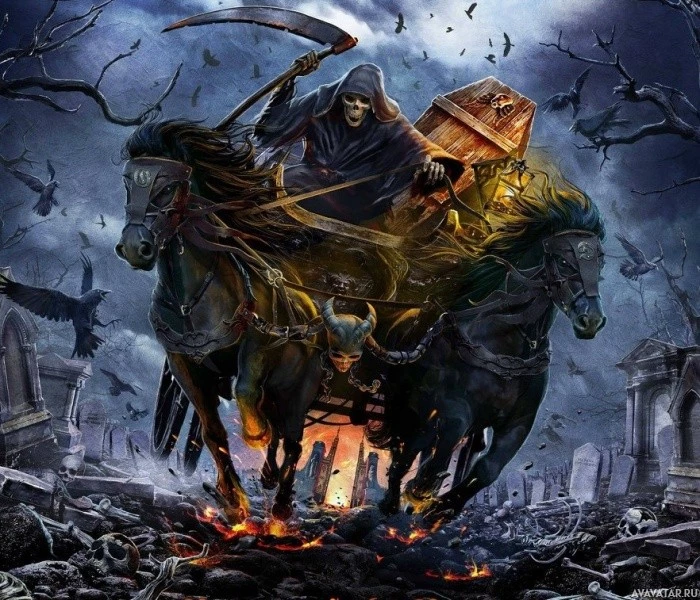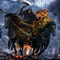 a dramatic scene with an individual dressed in what appears to be a dark, possibly demonic or evil figure, riding a horse. This character is holding a skull and is surrounded by chaos and destruction, which might be associated with death or the apocalypse. The background features dark,