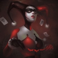 playing cards and has a somewhat mischievous expression on her face. The background suggests a dark and moody atmosphere with