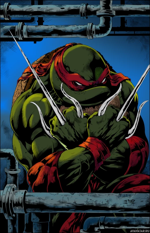 Ninja Turtles (TMNT). He is depicted with his arms crossed in front of him and appears to be wearing a bandana on his head. The background suggests