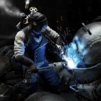 a battle scene with mechanical or robotic elements, which aligns with the theme of the game.
