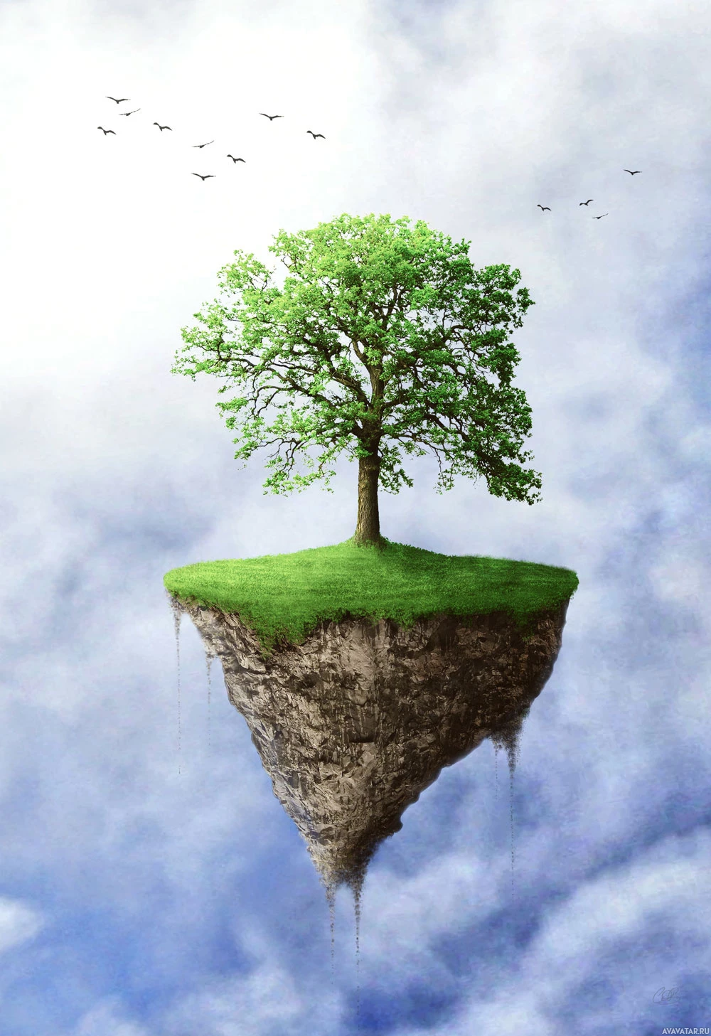 a floating island. The island is surrounded by water, and there are birds flying in the sky above it. The overall scene is surreal and gives the impression that the island is floating in the sky, defying gravity.