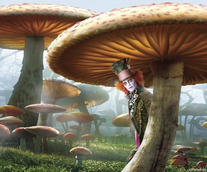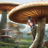 Alice in Wonderland." It shows Alice (played by Mia Wasikowska) surrounded by large mushrooms with bright,