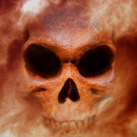 a red background, which could be interpreted as flames. The skull is prominently displayed in the center of the frame, and it appears to be somewhat blurred or distorted, giving it a fiery appearance. This