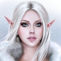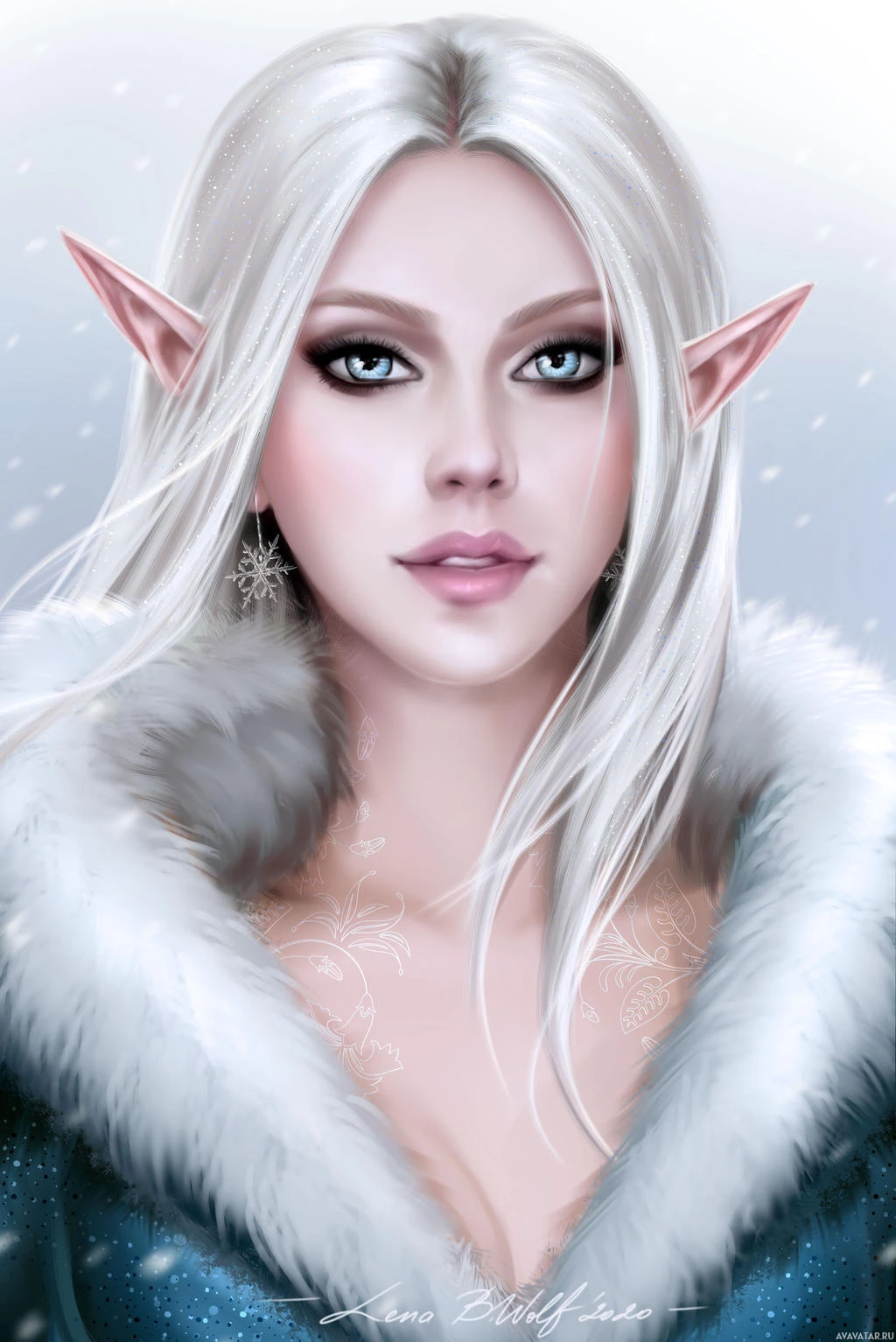 white hair, pointed ears characteristic of elves in mythology and folklore, and is adorned with what seems to be a fur trimmed cloak or coat. She is looking directly at the viewer, and there's