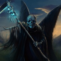 a skeletal figure with wings, often associated with the concept of death. This character is holding a scythe in one hand and appears to be standing on
