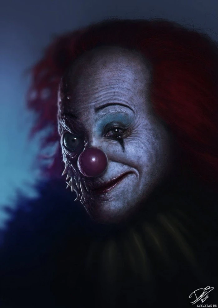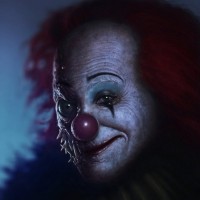 pale skin, dark eye sockets, and a sinister smile, which contributes to his menacing appearance. The color palette is muted, giving the image a somewhat dark or eerie atmosphere.