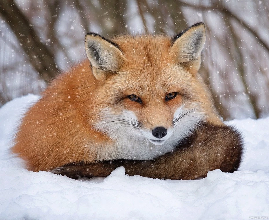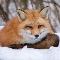 a natural environment, possibly during winter when there is snow on the ground. The fox's fur looks thick and well-suited for