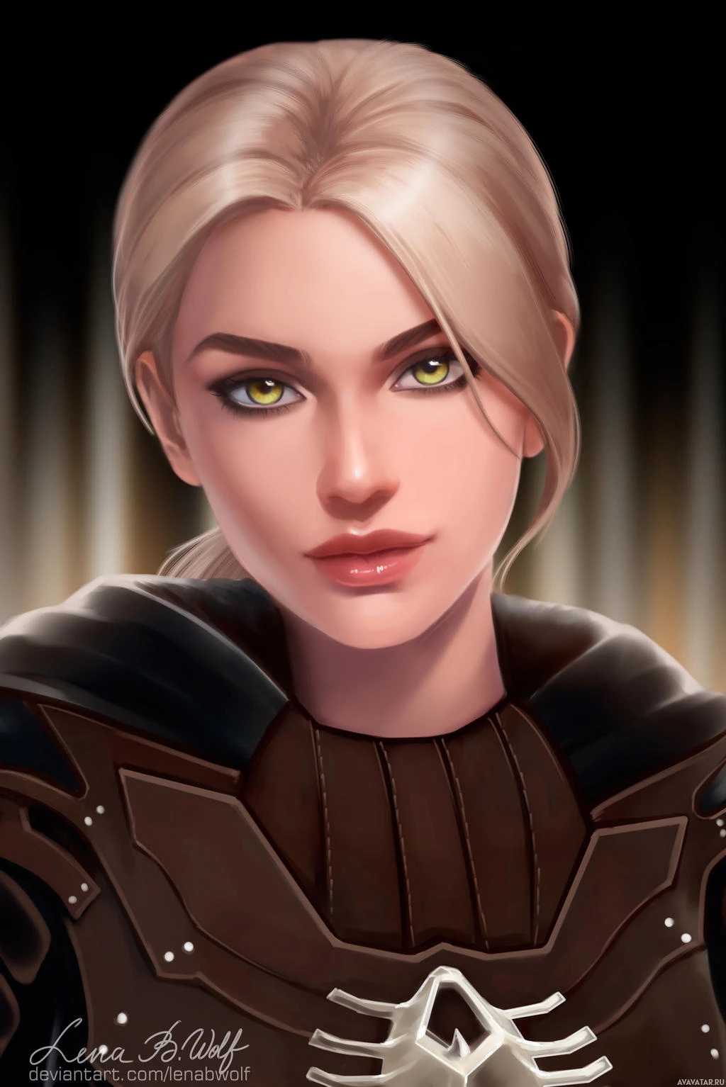 blue eyes and is depicted wearing what appears to be armor or a protective outfit, suggesting she may be from a fantasy or sci-fi setting. There's no text visible in the image itself.