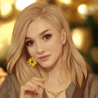 blonde hair, holding up a flower near her face. She appears to be smiling gently. The background suggests it might be an evening setting, possibly in