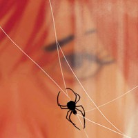 The image features a woman with one eye visible, and she appears to be looking out of that eye. There is also a spider in the picture, which is perched on what looks like a web or
