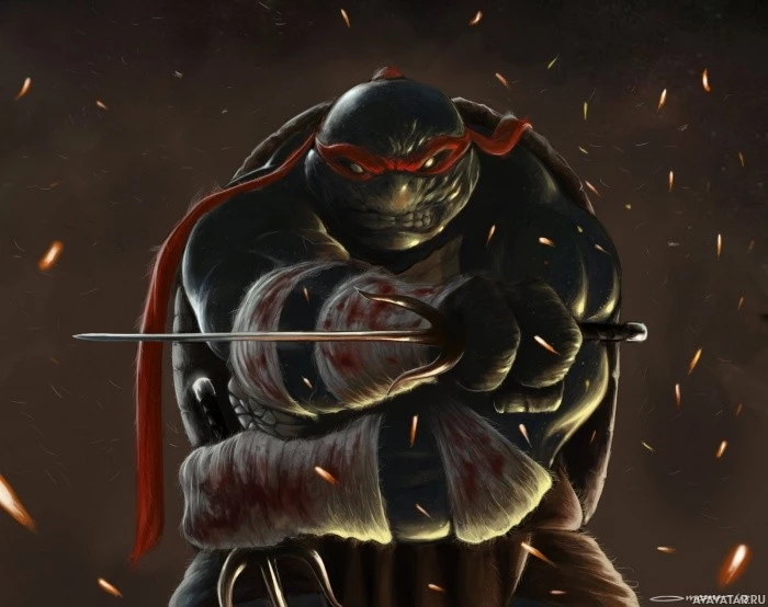 Mutant Ninja Turtles series. He is depicted holding a sword in his hands and wearing his signature red bandana,
