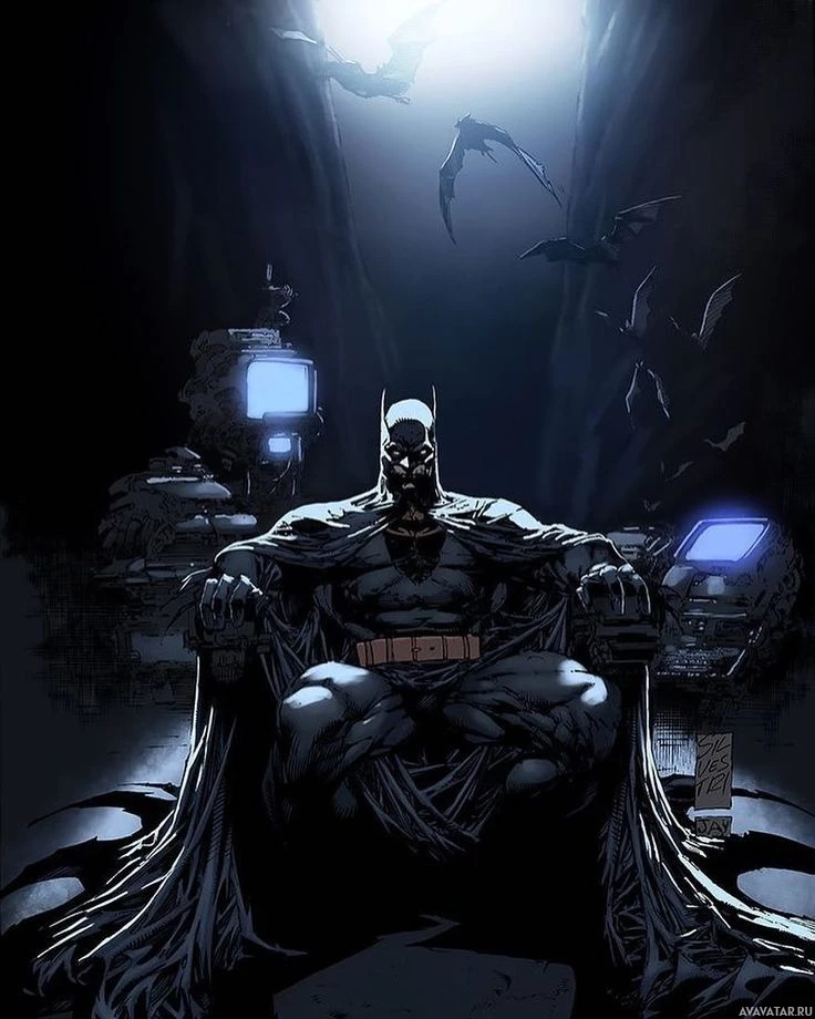 black cowl, cape, and emblem. Surrounding him are numerous bats, which seem to be flying from various directions towards an unseen