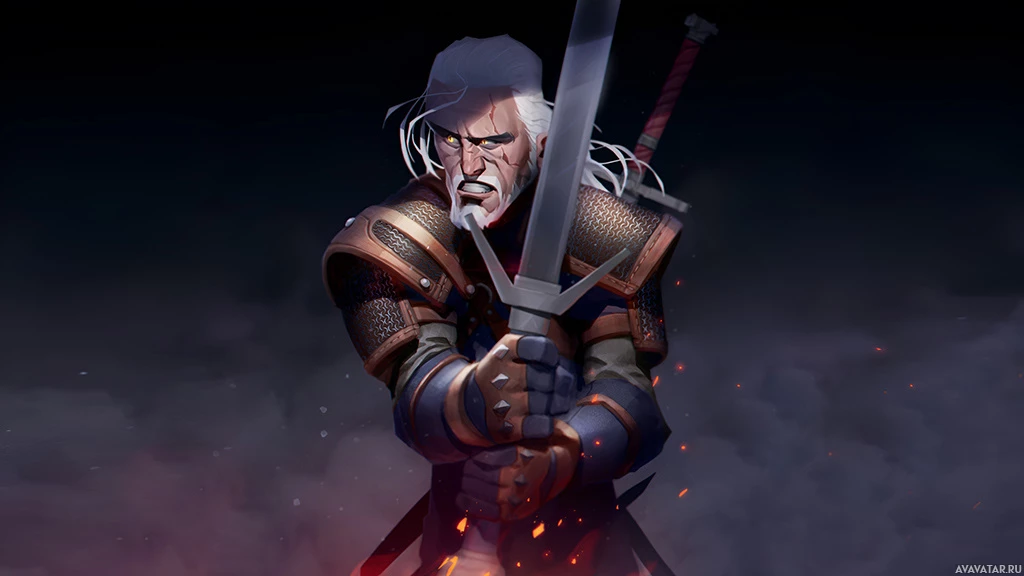 Это изображение персонажа из игры «Ведьмак 3: Дикая Охота». Изображенный персонаж — Геральт, один из главных героев сериала. Он показывает, что держит мечи и, кажется, готов к бою или приключениям.