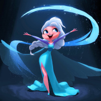 blonde hair and is wearing a long blue dress with a light-colored shirt underneath. Her expression is joyful as she is smiling broadly with her arms outstretched. The background is dark, suggesting that the scene might be taking place at night or in a dimly