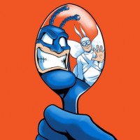 animated characters on its bowl. On the left side of the spoon, there's an anthropomorphic tick character, who appears to be upset or angry, as indicated by his expression and gesture. On the right side, there is a blue