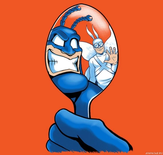 superhero character, seemingly responding to or reacting to the situation with his hands outstretched in a friendly or reassuring manner. Both characters are from "The Tick," which is