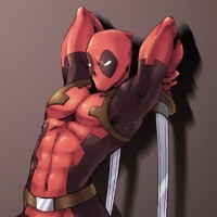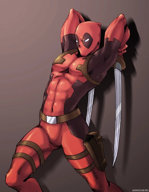 The image shows an illustrated version of Deadpool, a popular comic