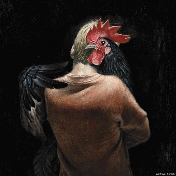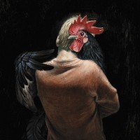 The image depicts an artistic representation of a child embracing a chicken. The chicken is prominently displayed on the person's back, and it has characteristics of both roosters and hens, with