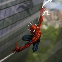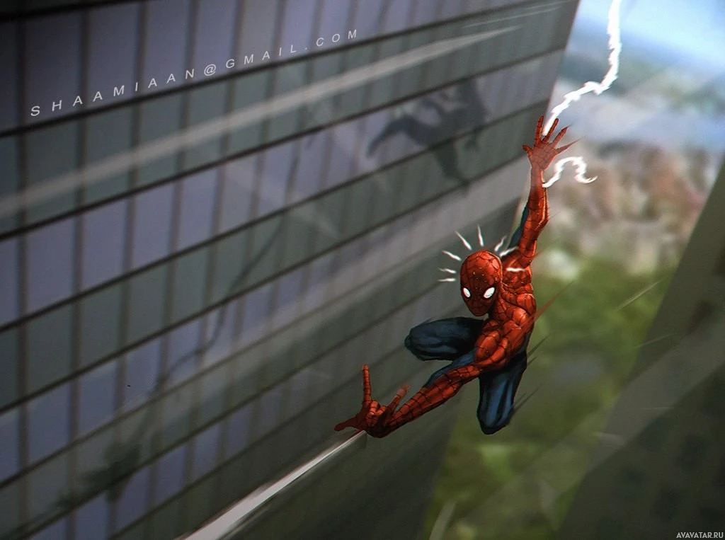 The image features a stylized depiction of Spider-Man, a fictional superhero character from