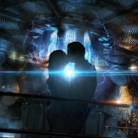 an intimate moment; one is holding the other in a close embrace or kiss. In the background, there is what looks like a spacecraft or some form of