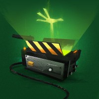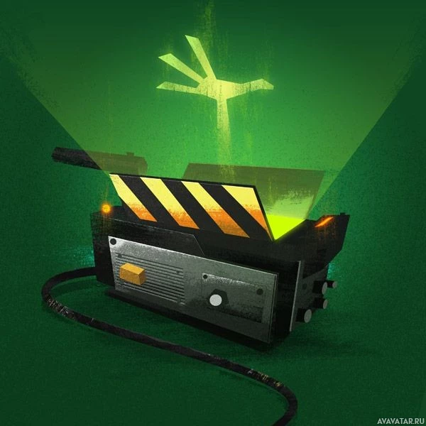 movie camera with an attached clapperboard, which is used for synchronizing picture and sound on film sets. There's a greenish-black glow around the camera, giving it a slightly eerie or mysterious appearance. Additionally, there are two pairs of eyes peeking out from behind the clapperboard, suggesting that the camera is haunted. The overall effect gives the impression of a 'ghost camera,' which would be