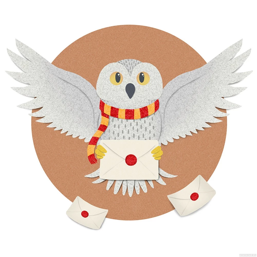 The image features an illustration of a bird, specifically resembling an owl, sitting and holding what appears to be an envelope with its feet. The owl is depicted with detailed feathers and is wearing a scarf that is typically associated with