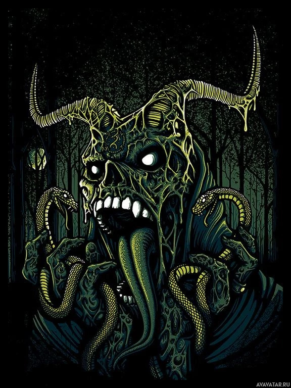 sharp teeth and appears to be made of some sort of dark material or substance that has a glowing greenish hue in certain areas. The creature's design is reminiscent of a demonic or