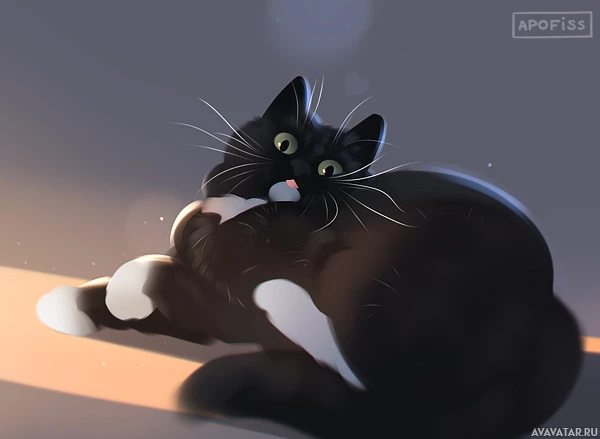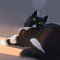 The image features a stylized depiction of a black and white cat sitting on what appears to be a windowsill. The cat has a round body, long whiskers, and is looking towards the viewer with its eyes wide open, giving it an alert or