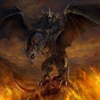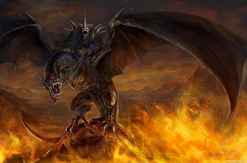 earth mythology, specifically from "The Lord of the Rings" series. The Witch-king is shown riding on a creature that appears to be a dragon or a monstrous beast with wings and horns, which is characteristic of