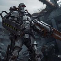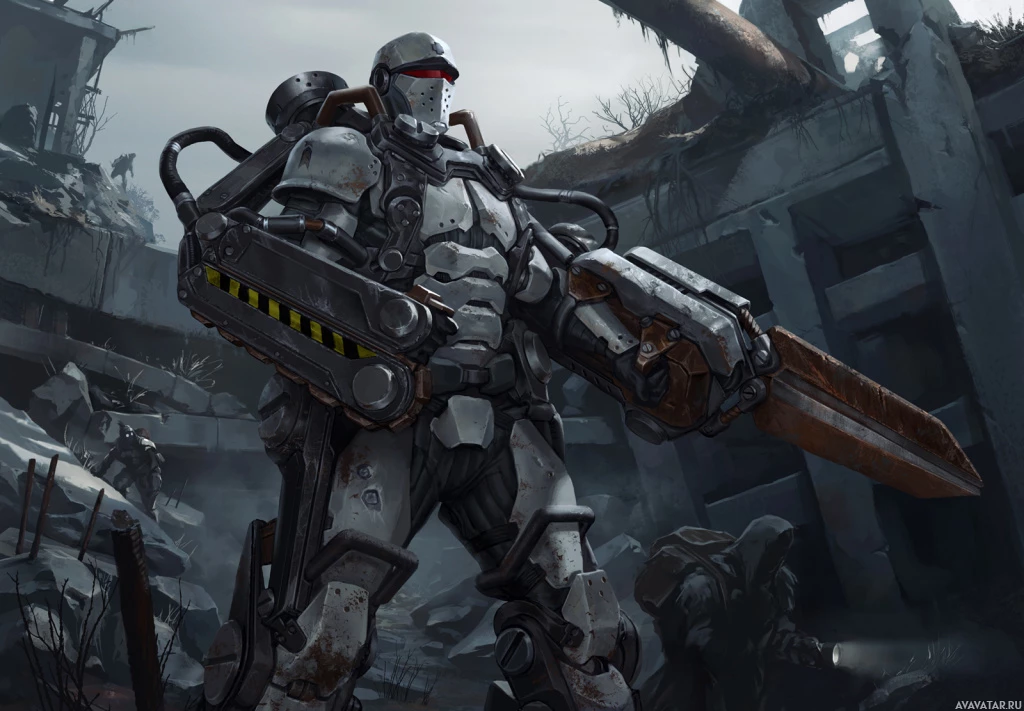 armored soldier is holding what looks like a weapon, possibly a gun or an explosive device, given the context of the image and the description provided. The background suggests a destroyed landscape with ruins and debris, indicating that this scene might be taking place after some sort of