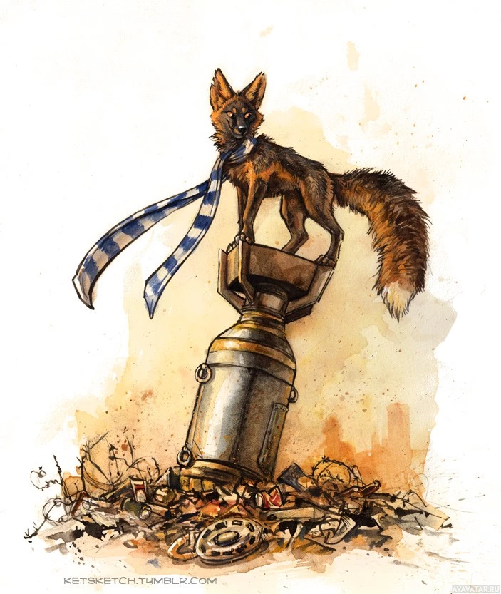 setting with machinery and debris scattered around. The fox is anthropomorphized, as it's dressed in